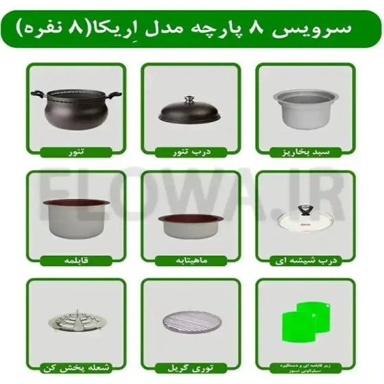 شامل تنور/درب تنور/قابلمه نچسب با بدنه هارداندایز/ماهیتابه هاردانادایز/سبد بخارپز/توری گریل/شعله پخش کن استیل تنور/یک جفت زیر قابلمه نسوز